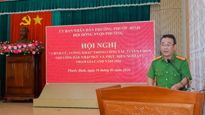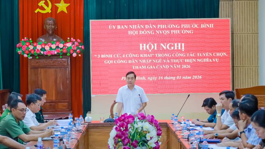 Sáng 16-1, Hội đồng Nghĩa vụ quân sự (NVQS) phường Phước Bình, tỉnh Đồng Nai tổ chức hội nghị “3 bình cử, 4 công khai” trong công tác tuyển chọn, gọi công dân nhập ngũ và thực hiện nghĩa vụ tham gia Công an Nhân dân (CAND) năm 2026. Đồng chí Nguyễn Văn Dũng – Phó Bí thư Đảng ủy, Chủ tịch UBND, Chủ tịch Hội đồng NVQS phường Phước Bình chủ trì hội nghị. Cùng dự có các đồng chí Ủy viên Hội đồng NVQS phường; Bí thư Chi bộ, Trưởng các khu phố trên địa bàn phường.