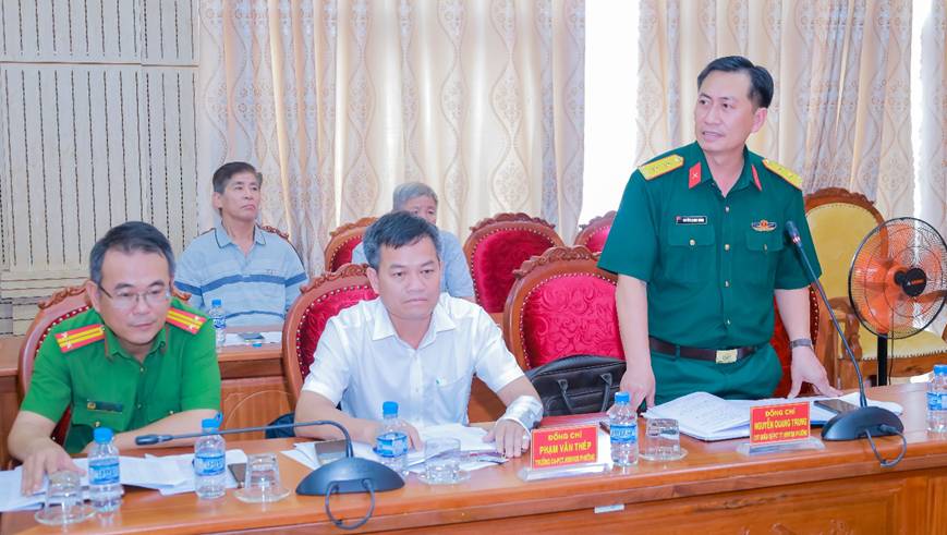 Trung tá Nguyễn Quang Trung – Chỉ huy trưởng Quân sự phường, Phó chủ tịch Thường trực Hội đồng NVQS phường phát biểu tại hội nghị.