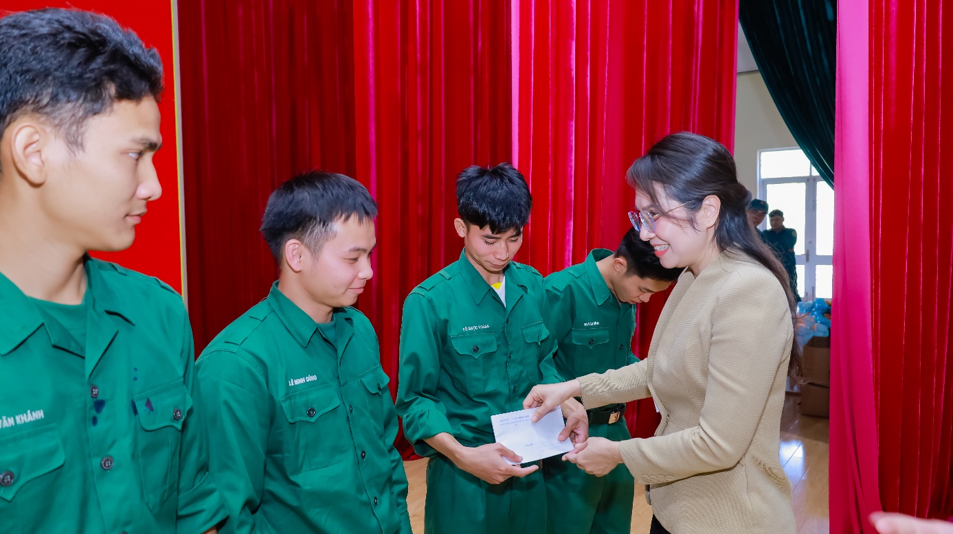 Đồng chí Huỳnh Thị Thùy Trang – Tỉnh ủy viên, Bí thư Đảng ủy phường Phước Bình tặng quà cho các thanh niên hoàn thành NQVS