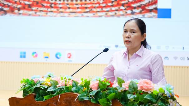 Giảng viên Nguyễn Thị Thanh Huyền – chuyên viên Ban Xây dựng Đảng Đảng ủy phường trình bày các chuyên đề tại hội nghị.