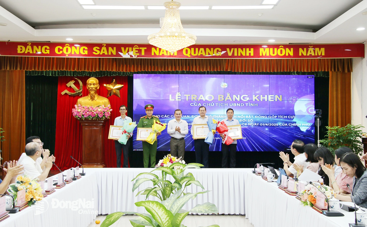 Ủy viên Ban Thường vụ Tỉnh ủy, Phó Chủ tịch UBND tỉnh Đồng Nai Lê Trường Sơn trao bằng khen của UBND tỉnh cho các cơ quan, đơn vị có thành tích nổi bật, đóng góp tích cực về công tác chuyển đổi số trong triển khai thực hiện Nghị quyết số 71/NQ-CP của Chính phủ trên địa bàn tỉnh. Ảnh: Hải Quân