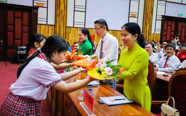 Các em thiếu nhi tặng hoa đại biểu dự Đại hội
