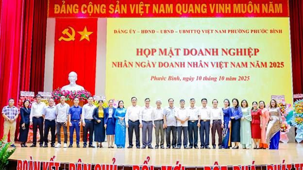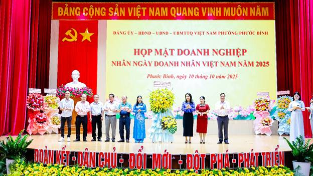Chiều ngày 10/10, Đảng ủy, HĐND-UBND-UBMTTQVN phường Phước Bình đã tổ chức Họp mặt doanh nghiệp trên địa bàn phường năm 2025 nhân kỷ niệm Ngày Doanh nhân Việt Nam 13/10. Dự chương trình có đồng chí Vũ Sao Sáng - Phó Giám đốc Sở Công thương tỉnh Đồng Nai; Tỉnh ủy viên, Bí thư Đảng ủy phường Huỳnh Thị Thùy Trang. Các đồng chí Thường trực, Ban Thường vụ Đảng ủy, HĐND-UBND-UBMTTQVN phường; các đồng chí nguyên lãnh đạo huyện, thị xã Phước Long các thời kỳ cùng đông đảo các doanh nhân, doanh nghiệp, hợp tác xã tiêu biểu trên địa bàn phường…