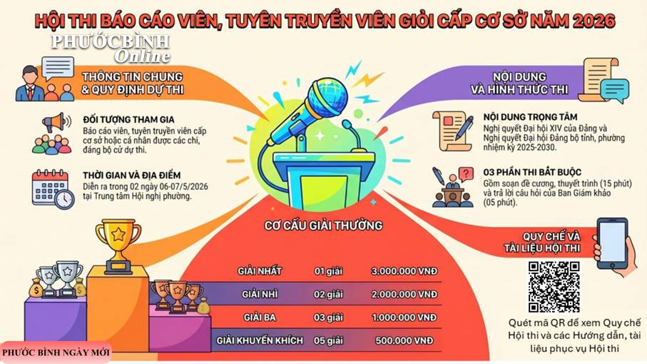 <p style="line-height:150%;"><span style="font-size:15.0pt;"><span style="line-height:150%;">Đây là Hội thi do Ban Thường vụ Đảng ủy phường Phước Bình tổ chức nhằm &nbsp;tuyên truyền sâu rộng trong cán bộ, đảng viên và các tầng lớp Nhân dân những nội dung cốt lõi, mới, quan trọng trong Nghị quyết Đại hội XIV của Đảng, Nghị quyết Đại hội đại biểu Đảng bộ tỉnh Đồng Nai lần thứ I, nhiệm kỳ 2025-2030, Nghị quyết Đại hội đại biểu Đảng bộ phường Phước Bình lần thứ I, nhiệm kỳ 2025-2030, sớm đưa nghị quyết vào cuộc sống. Đồng thời xây dựng, đào tạo, bồi dưỡng đội ngũ báo cáo viên, tuyên truyền viên có bản lĩnh chính trị vững vàng, giỏi chuyên môn, sâu sát cơ sở.</span></span></p><p style="line-height:150%;"><span style="font-size:15.0pt;"><span style="line-height:150%;"><strong>1. ĐỐI TƯỢNG DỰ THI&nbsp;</strong></span></span></p><p style="line-height:150%;"><span style="font-size:15.0pt;"><span style="line-height:150%;">Là báo cáo viên, tuyên truyền viên hiện đang công tác tại các cơ quan, đơn vị, khu phố trên địa bàn phường; các cá nhân được các chi, đảng bộ trực thuộc Đảng ủy phường cử tham gia dự thi.</span></span></p><p style="line-height:150%;"><span style="font-size:15.0pt;"><span style="line-height:150%;"><strong>2. NỘI DUNG VÀ HÌNH THỨC THI&nbsp;</strong></span></span></p><p style="line-height:150%;"><span style="font-size:15.0pt;"><i><span style="line-height:150%;"><strong>2.1. Nội dung thi:&nbsp;</strong></span></i></span></p><p style="line-height:150%;"><span style="font-size:15.0pt;"><span style="line-height:150%;">Mỗi thí sinh tham dự thi lựa chọn một trong những nội dung sau: Nghị quyết Đại hội đại biểu toàn quốc lần thứ XIV của Đảng; Chương trình hành động thực hiện Nghị quyết Đại hội đại biểu toàn quốc lần thứ XIV của Đảng; Nghị quyết Đại hội đại biểu Đảng bộ tỉnh lần thứ I, nhiệm kỳ 2025-2030; Chương trình hành động thực hiện Nghị quyết Đại hội đại biểu Đảng bộ tỉnh; Nghị quyết Đại hội đại biểu Đảng bộ phường lần thứ I, nhiệm kỳ 2025-2030; Kế hoạch thực hiện Nghị quyết Đại hội đại biểu Đảng bộ phường. Trong đó khuyến khích các thí sinh liên hệ thực tiễn cơ quan, đơn vị nơi thí sinh công tác.</span></span></p><p style="line-height:150%;"><span style="font-size:15.0pt;"><i><span style="line-height:150%;">2.2. Hình thức thi:</span></i><span style="line-height:150%;"> Mỗi thí sinh tham gia đủ 03 phần thi: Soạn đề cương; Thuyết trình; Trả lời câu hỏi.</span></span></p><p style="line-height:150%;"><span style="font-size:15.0pt;"><span style="line-height:150%;" lang="EN-AU"><strong>3. THỜI GIAN, ĐỊA ĐIỂM TỔ CHỨC HỘI THI</strong></span></span></p><p style="line-height:150%;"><span style="font-size:15.0pt;"><span style="line-height:150%;" lang="EN-AU">- Thời gian:<strong>&nbsp;</strong>Hội thi dự kiến diễn ra trong&nbsp;<strong>02</strong> ngày&nbsp;<strong>06-07/5/2026</strong>.</span></span></p><p style="line-height:150%;"><span style="font-size:15.0pt;"><span style="line-height:150%;" lang="EN-AU">- Địa điểm: Tại Trung tâm Hội nghị phường.</span></span></p><p style="line-height:150%;"><span style="font-size:15.0pt;"><span style="line-height:150%;" lang="EN-AU"><strong>4. CƠ CẤU GIẢI THƯỞNG&nbsp;</strong></span></span></p><p style="line-height:150%;"><span style="font-size:15.0pt;"><span style="line-height:150%;" lang="EN-AU">- 01 giải Nhất, trị giá 3.000.000đ</span></span></p><p style="line-height:150%;"><span style="font-size:15.0pt;"><span style="line-height:150%;" lang="EN-AU">- 02 giải Nhì mỗi giải trị giá 2.000.000đ</span></span></p><p style="line-height:150%;"><span style="font-size:15.0pt;"><span style="line-height:150%;" lang="EN-AU">- 03 giải Ba mỗi giải 1.000.000đ</span></span></p><p style="line-height:150%;"><span style="font-size:15.0pt;"><span style="line-height:150%;" lang="EN-AU">- 05 giải Khuyến khích mỗi giải trị giá 500.000đ</span></span></p><p style="line-height:150%;"><span style="font-size:15.0pt;"><span style="line-height:150%;" lang="EN-AU">Ban Thường vụ Đảng ủy phường cấp Giấy chứng nhận tham gia Hội thi Báo cáo viên, tuyên truyền viên giỏi cơ sở năm 2026 và xếp loại cho thí sinh dự Hội thi.&nbsp;</span></span></p><p style="line-height:150%;"><span style="font-size:15.0pt;"><span style="line-height:150%;" lang="EN-AU">Thành tích đạt giải tại Hội thi là một trong những tiêu chí để xếp loại thi đua, đánh giá cán bộ trong năm.</span></span></p><p style="line-height:150%;text-align:center;"><span style="font-size:15.0pt;"><i><span style="line-height:150%;" lang="EN-AU">Chi tiết Quy chế Hội thi theo file đính kèm hoặc quét mã QR.</span></i></span></p><figure class="image"><img style="aspect-ratio:907/510;" src="https://phuocbinh.dongnai.gov.vn/uploads/phuocbinh/news/2026_04/image_1.jpeg" width="907" height="510" v:shapes="Picture_x0020_1" uploadprocessed="true" /></figure>