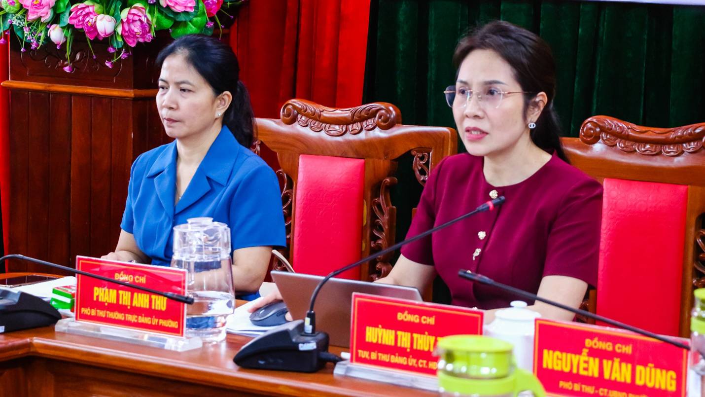 <div style="text-align: center;"><span style="background:white"><span style="font-size:14pt"><span style="background:white"><span style="line-height:150%"><span style="font-family:&#039;Times New Roman&#039;,serif"><i><span lang="EN" style="font-size:13.0pt"><span style="line-height:150%"><span style="color:black">Tỉnh ủy viên, Bí thư Đảng ủy, Chủ tịch HĐND phường - Đ/c Huỳnh Thị Thùy Trang trao đổi các nội dung tại hội nghị</span></span></span></i></span></span></span></span></span></div>