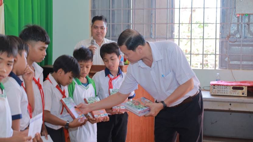 Ông Nguyễn Thành Sơn – UVBTV Đảng ủy, Phó Chủ tịch UBND phường Phước Bình tặng quà cho các em học sinh đồng bào DTTS có hoàn cảnh khó khăn khu phố Bình Minh