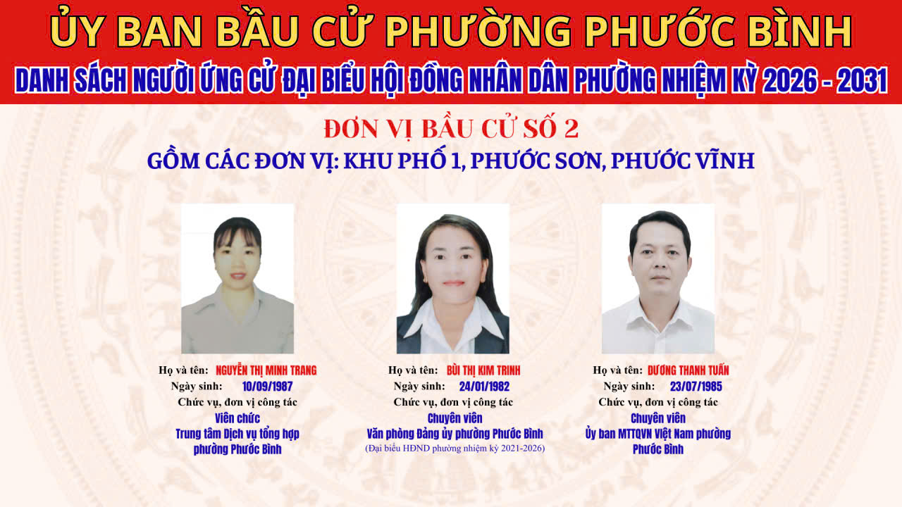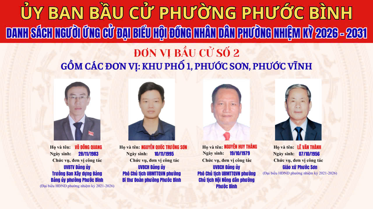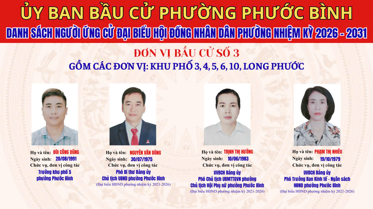 DANH SÁCH CHÍNH THỨC NHỮNG NGƯỜI ỨNG CỬ ĐẠI BIỂU HĐND PHƯỜNG PHƯỚC BÌNH NHIỆM KỲ 2026 - 2031 THEO TỪNG ĐƠN VỊ BẦU CỬ