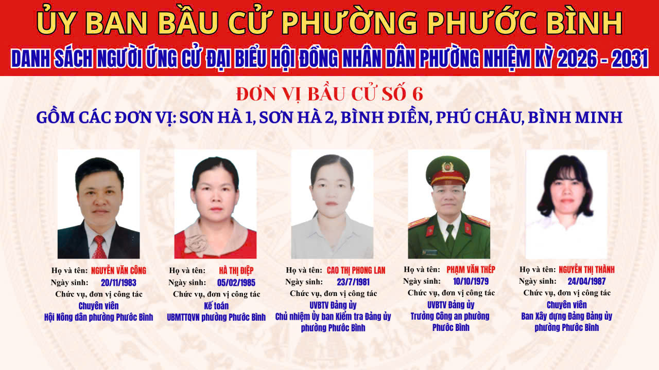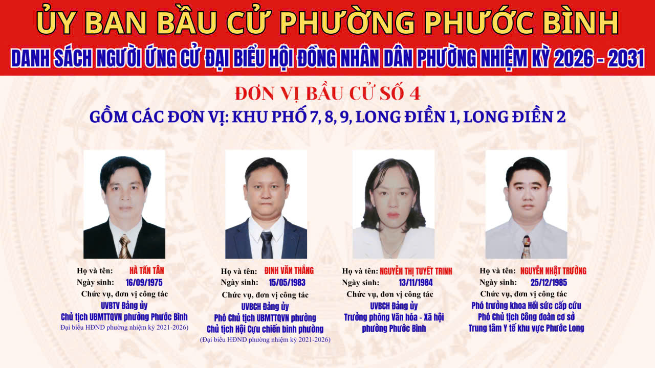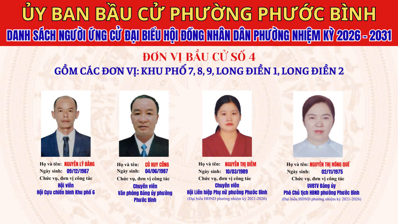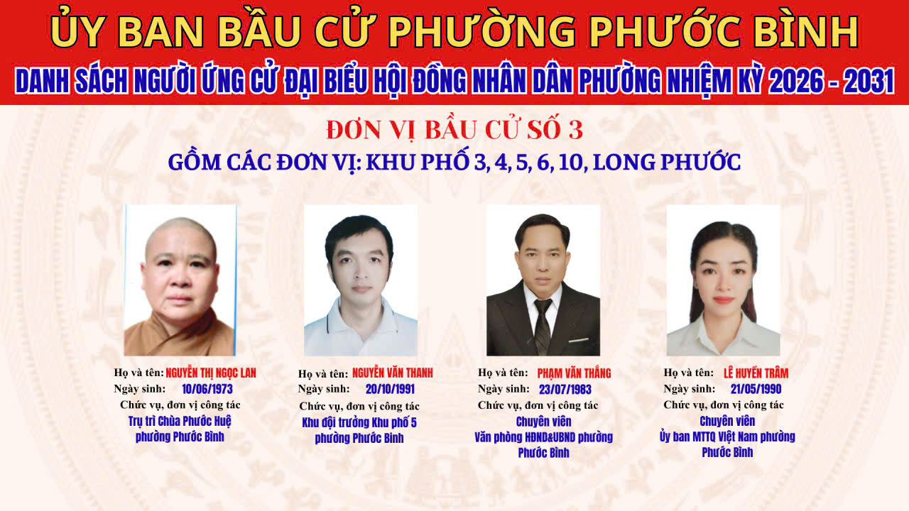 DANH SÁCH CHÍNH THỨC NHỮNG NGƯỜI ỨNG CỬ ĐẠI BIỂU HĐND PHƯỜNG PHƯỚC BÌNH NHIỆM KỲ 2026 - 2031 THEO TỪNG ĐƠN VỊ BẦU CỬ