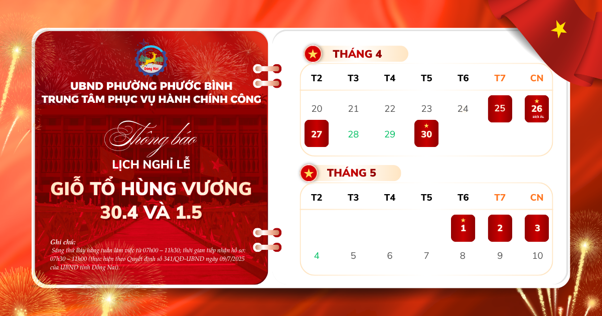 Trung tâm Phục vụ hành chính công phường Phước Bình ban hành Thông báo số 102/TB-TTPVHCC ngày 22/4/2026 về việc Nghỉ Lễ Giỗ tổ Hùng Vương (10/3 âm lịch), Ngày Giải phóng miền Nam (30/4) và Ngày Quốc tế lao động (01/05) năm 2026.