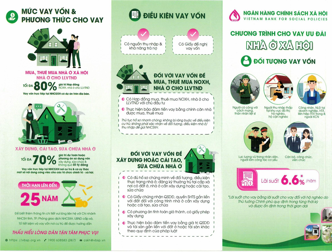 Ngân hàng Chính sách Xã hội (NHCSXH) thông báo về việc triển khai Chương trình cho vay ưu đãi Nhà ở xã hội, giúp người dân có cơ hội sở hữu hoặc cải tạo mái ấm với điều kiện vay thuận lợi, lãi suất thấp và thời hạn dài.