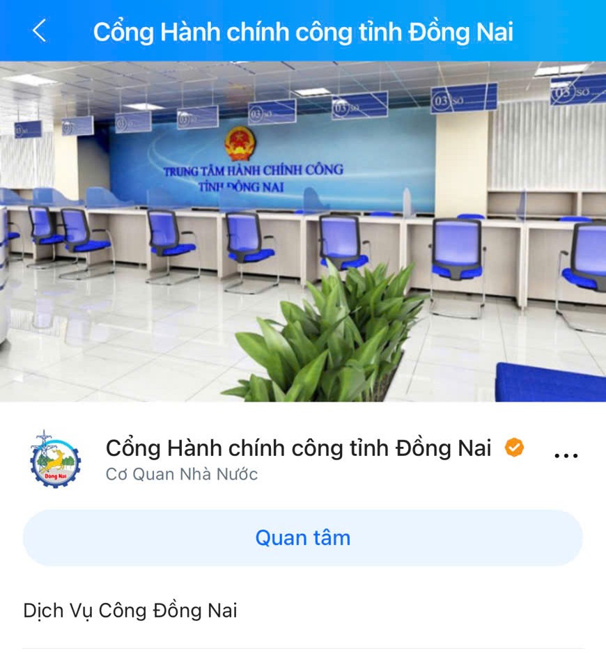 Bước 4: Bấm "Quan tâm" kênh Zalo OA Cổng hành chính công tỉnh Đồng Nai.