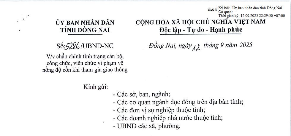 Ngày 12/9/2025, Chủ tịch UBND tỉnh Đồng Nai đã ký ban hành công văn khẩn về việc tăng cường xử lý nghiêm các trường hợp cán bộ, công chức, viên chức vi phạm quy định nồng độ cồn khi tham gia giao thông.