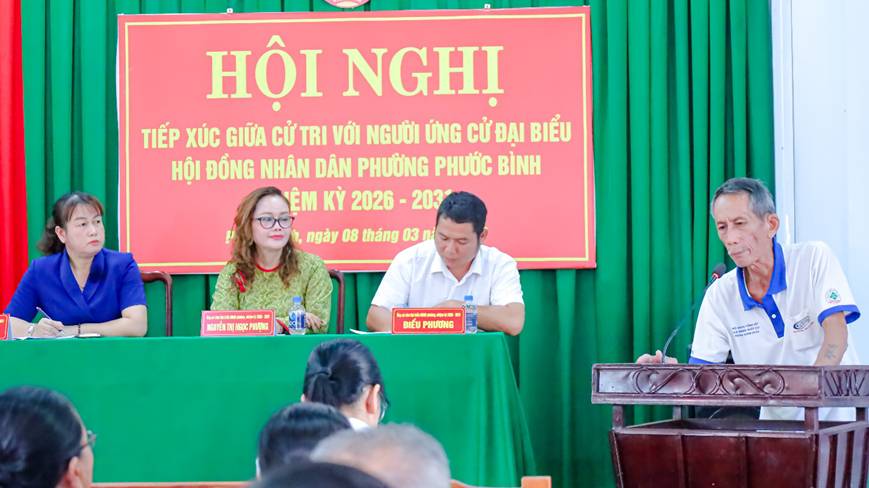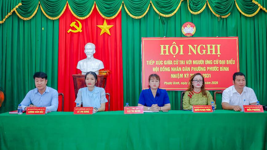 Chiều ngày 8/3 tại khu phố Nhơn Hòa 2, Ban Thường trực Ủy ban MTTQ Việt Nam phường Phước Bình đã tổ chức hội nghị tiếp xúc cử tri 5 khu phố: An Lương, Nhơn Hòa 1, Nhơn Hòa 2, Bù Xiết và Long Giang với người ứng cử đại biểu HĐND phường Phước Bình nhiệm kỳ 2026 – 2031, đơn vị bầu cử số 5. Phó Chủ tịch UBMTTQVN, Chủ tịch Hội LHPN phường Trịnh Thị Hường chủ trì hội nghị. Cùng dự còn có các Ban điều hành và cử tri các khu phố.