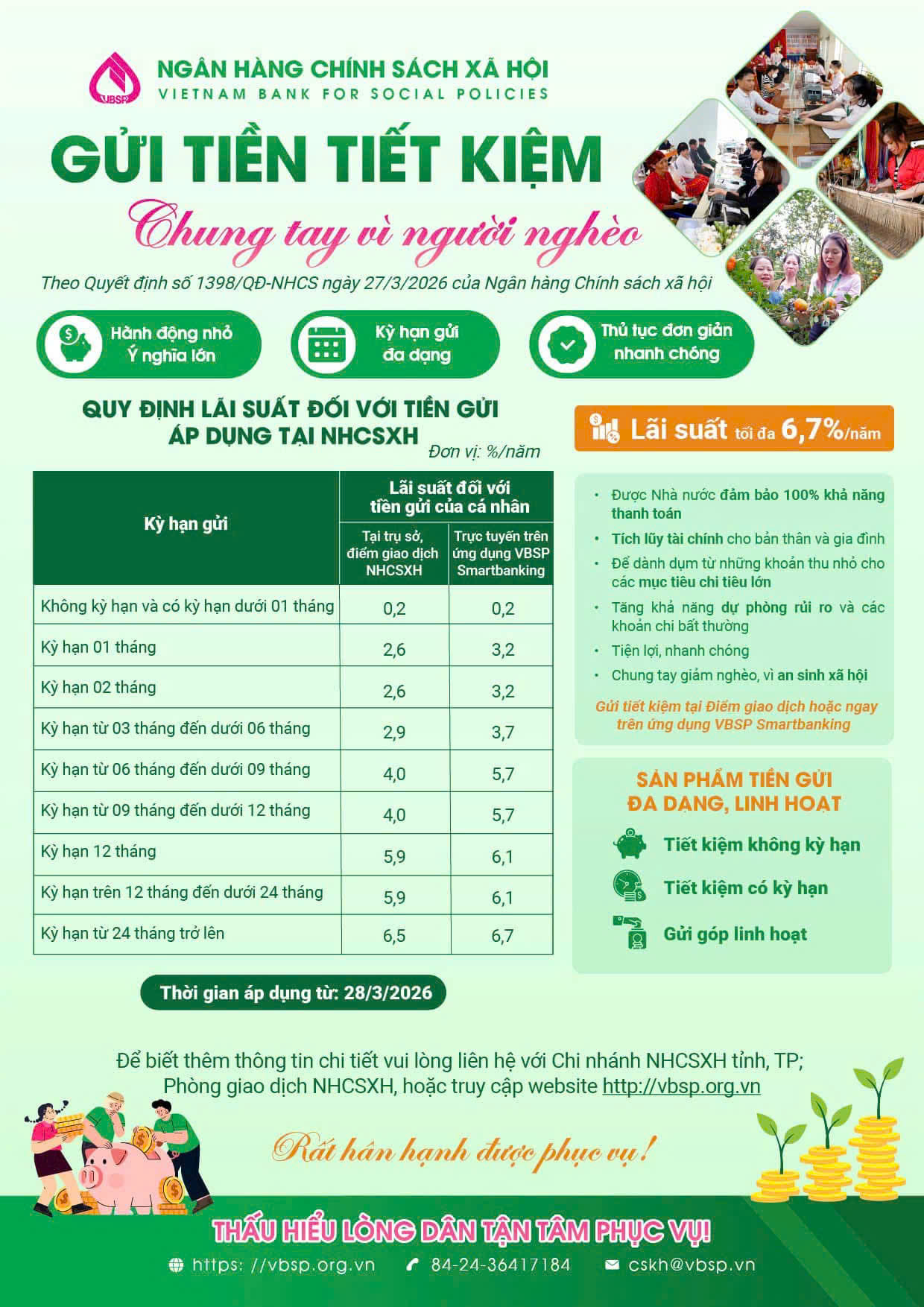 Theo đó, các sản phẩm tiền gửi tại Ngân hàng Chính sách xã hội được thiết kế đa dạng, phù hợp với nhu cầu của người dân như: tiết kiệm không kỳ hạn, tiết kiệm có kỳ hạn và gửi góp linh hoạt. Mức lãi suất tối đa lên đến 6,7%/năm, áp dụng từ ngày 28/3/2026, tạo điều kiện thuận lợi để người dân tích lũy tài chính, đồng thời góp phần vào nguồn vốn cho vay ưu đãi phục vụ phát triển kinh tế - xã hội.