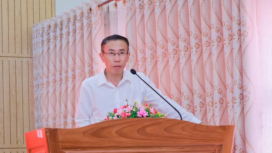 Đồng chí Võ Đông Quang - Ủy viên Ban thường vụ Đảng ủy phường, Phó Bí thư Đảng ủy Các cơ quan Đảng, Trưởng Ban Xây dựng Đảng phường Phước Bình phát biểu tại hội nghị. Ảnh: Ngọc Cương