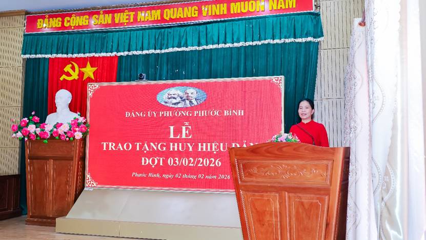 Chiều ngày 2/2/2026, Đảng ủy phường Phước Bình đã tổ chức Lễ trao tặng Huy hiệu Đảng đợt 3/2/2026. Dự lễ có đồng chí Phạm Thị Anh Thư – Phó Bí thư Thường trực Đảng ủy, Chủ tịch HĐND phường; Nguyễn Văn Dũng – Phó Bí thư Đảng ủy, Chủ tịch UBND phường; lãnh đạo Đảng ủy, HĐND, UBND, UBMTTQVN phường; Bí thư, Phó Bí thư chi bộ các khu phố.