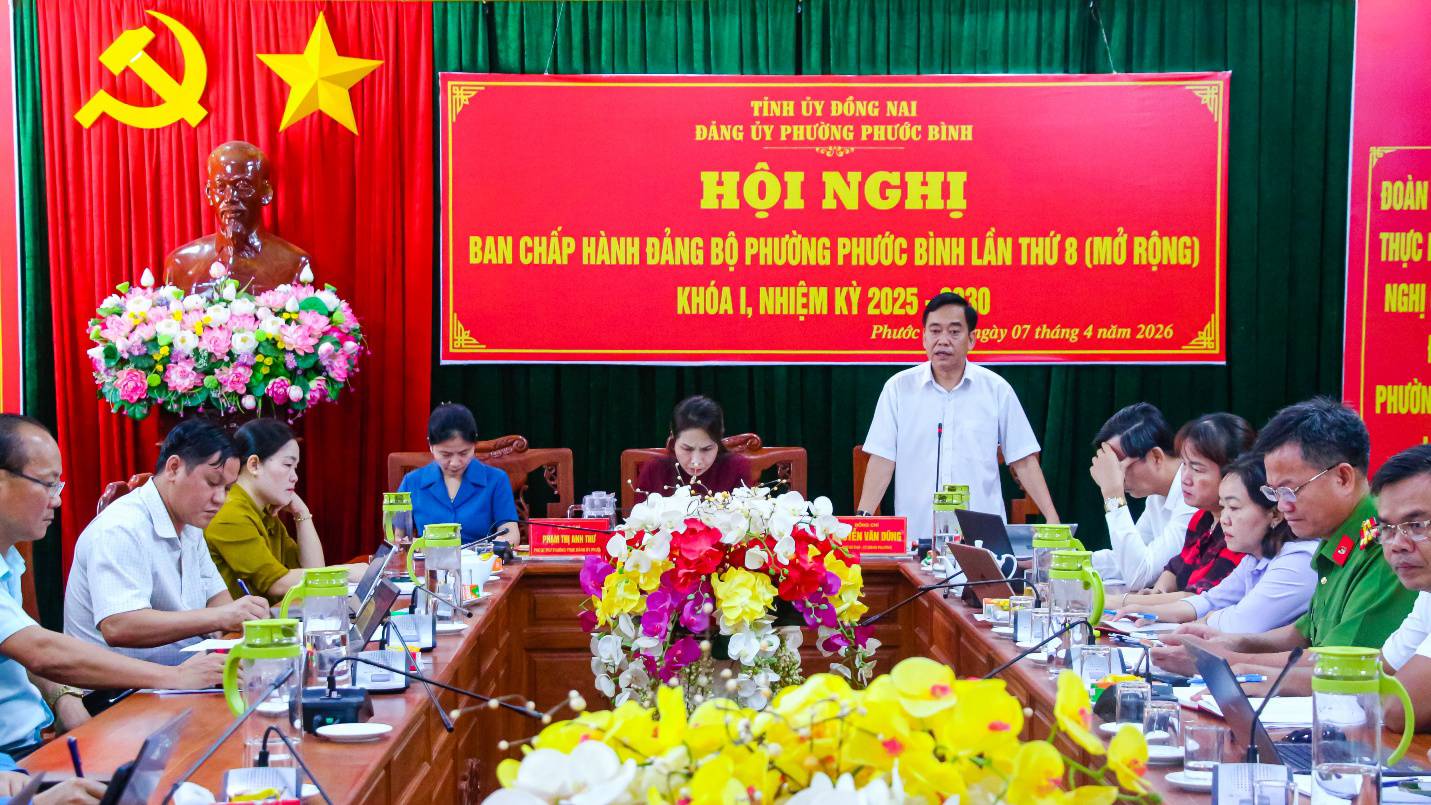 Chiều ngày 7/4, Thường trực Đảng ủy phường Phước Bình gồm các đồng chí: Huỳnh Thị Thùy Trang, Tỉnh ủy viên, Bí thư Đảng ủy, Chủ tịch HĐND phường; Phạm Thị Anh Thư, Phó Bí thư Thường trực Đảng ủy; Nguyễn Văn Dũng, Phó Bí thư Đảng ủy, Chủ tịch UBND phường đồng chủ trì Hội nghị Ban Chấp hành Đảng bộ phường lần thứ 8 (Mở rộng) khóa I, nhiệm kỳ 2025 – 2030 nhằm đánh giá tình hình thực hiện Nghị quyết quý 1 năm 2026; phương hướng, nhiệm vụ quý II năm 2026 của BCH Đảng bộ phường. Dự hội nghị có các đồng chí Ban Thường vụ, Ban Chấp hành Đảng ủy phường; lãnh đạo các ban, ngành, đoàn thể, các cơ quan, đơn vị trên địa bàn.