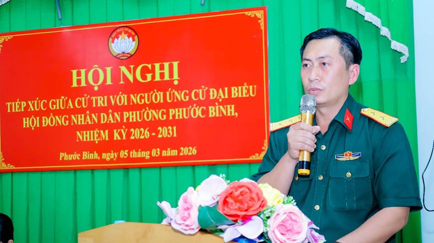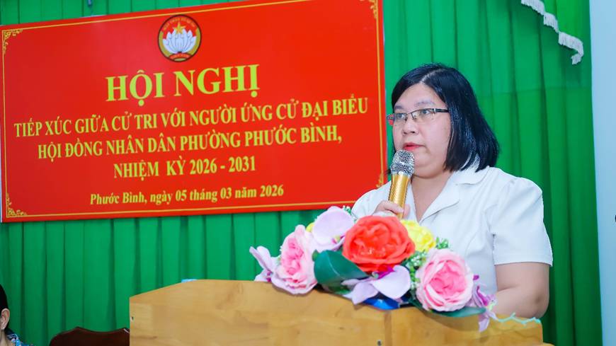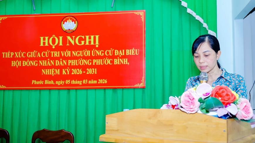 Chiều ngày 05/3/20206 tại đơn vị bầu cử số 1 phường Phước Bình, Ban Thường trực Ủy ban MTTQ Việt Nam phường đã tổ chức Hội nghị tiếp xúc giữa cử tri với người ứng cử Đại biểu HĐND phường nhiệm kỳ 2026 – 2031 gồm 5 ông bà: Phạm Thị Phương, Hiệu trưởng Trường THCS Long Phước; Huỳnh Thị Thùy Trang - Tỉnh ủy viên, Bí thư Đảng ủy phường; Nguyễn Quang Trung - UVBTV Đảng ủy, Chỉ huy trưởng Ban CHQS phường; Nguyễn Thị Kim Vân, Chuyên viên phòng Kinh Tế, Hạ tầng & Đô thị; Nguyễn Hồng Thục Viên, Chuyên viên phòng Văn hóa – Xã hội.