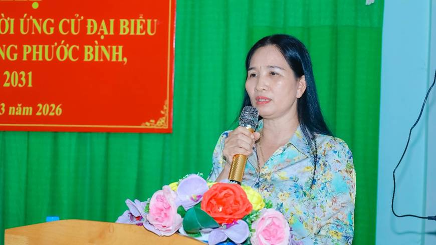 Bà Nguyễn Hồng Thục Viên, Chuyên viên phòng Văn hóa – Xã hội phường Phước Bình trình bày Chương trình hành động ứng cử ĐB HĐND phường nhiệm kỳ 2026 - 2031.