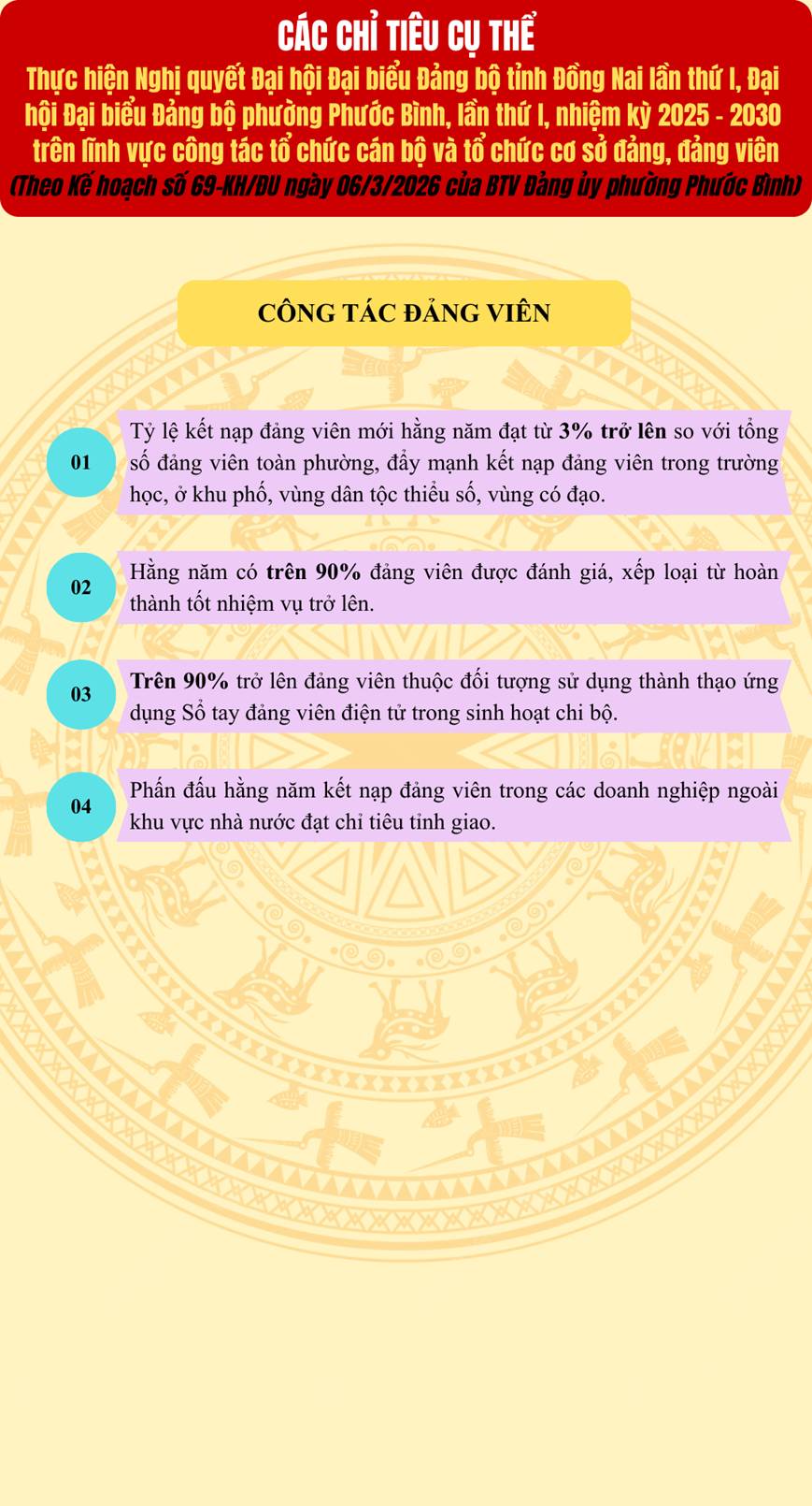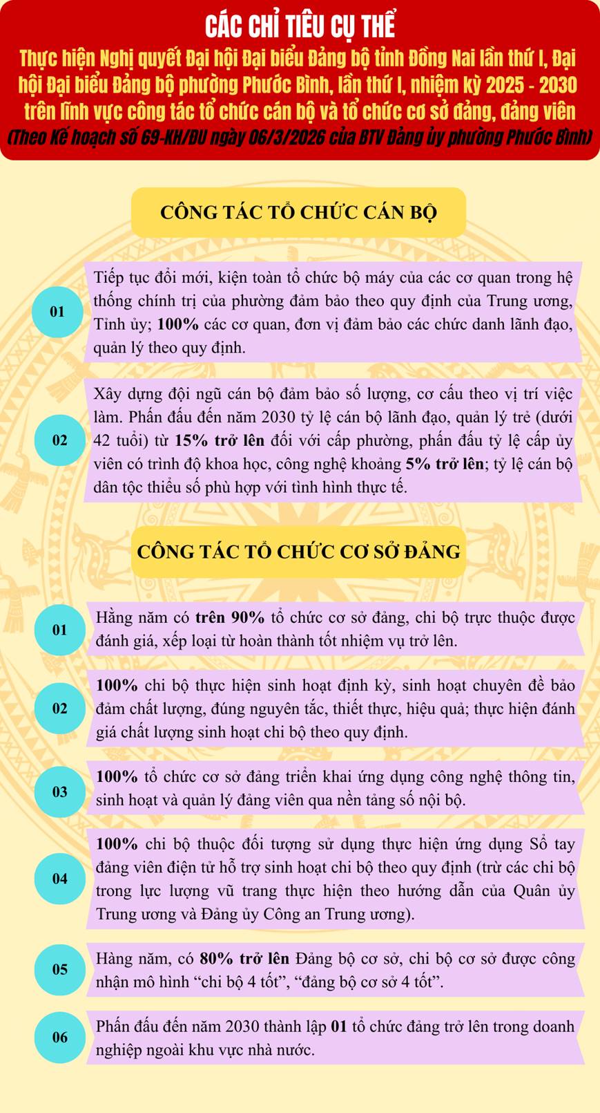 Trong đó, Kế hoạch đề ra 02 chỉ tiêu cụ thể thuộc công tác tổ chức cán bộ, 06 chỉ tiêu cụ thể thuộc công tác tổ chức cơ sở đảng và 04 chỉ tiêu thuộc công tác đảng viên. Đồng thời, đề ra 07 nhiệm vụ và giải pháp chủ nhằm đạt được các chỉ tiêu trên, góp phần thực hiện thắng lợi Nghị quyết Đại hội đại biểu Đảng bộ tỉnh và Nghị quyết Đại hội đại biểu Đảng bộ phường Phước Bình lần thứ I, nhiệm kỳ 2025-2030.
