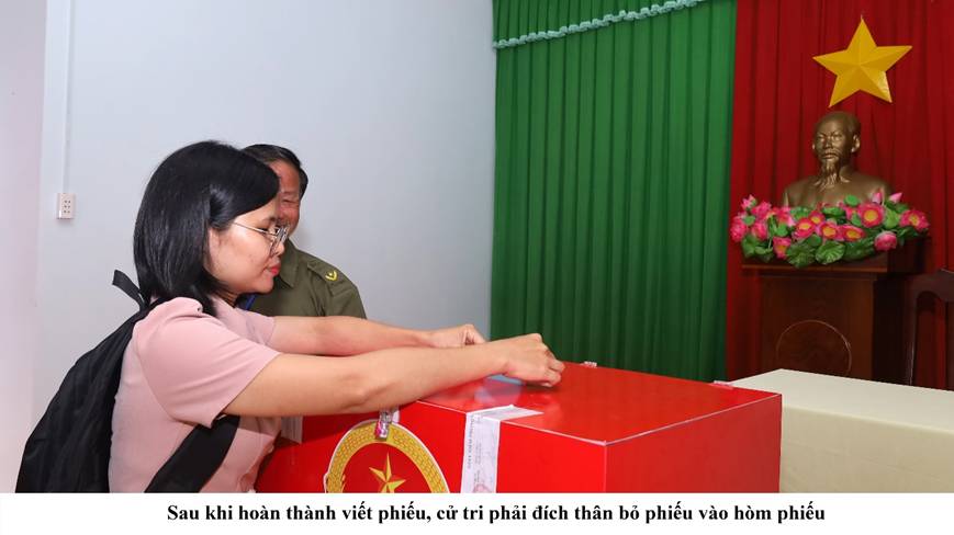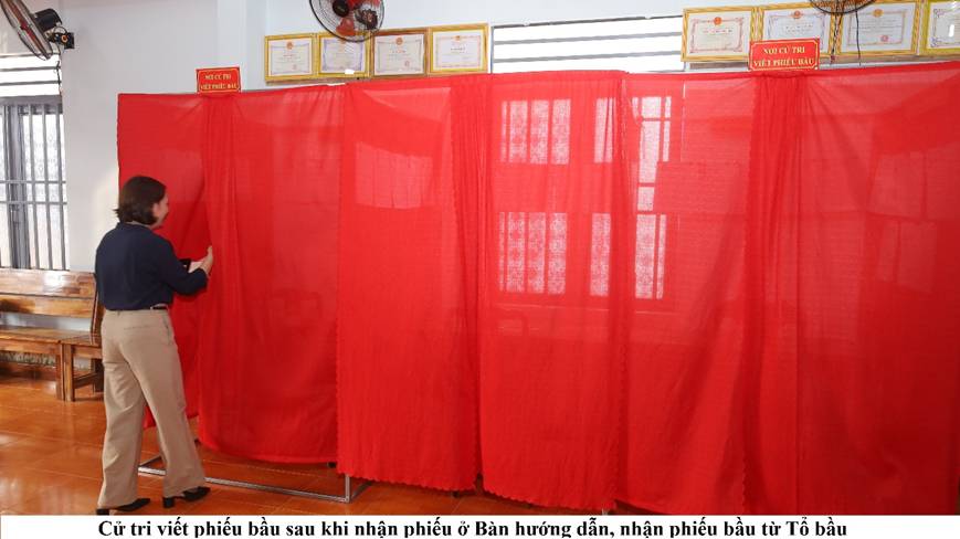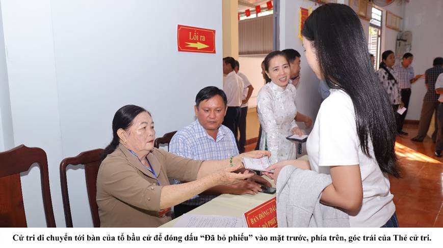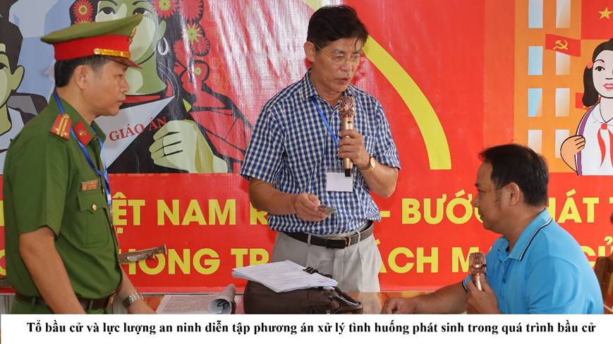 Tình huống diễn tập tại Khu vực bỏ phiếu số 12 với 100 cử tri tham gia. Các cử tri mang theo Thẻ cử tri đã được cấp đến địa điểm bỏ phiếu trong khoảng thời gian quy định; xuất trình thẻ cử tri tại bàn hướng dẫn, nhận phiếu bầu từ Tổ bầu cử (gồm: Phiếu bầu cử Đại biểu Quốc hội, Phiếu bầu cử Đại biểu HĐND cấp Tỉnh và Phiếu bầu cử Đại biểu HĐND phường); Vào phòng viết phiếu bầu cử (khi không tín nhiệm người ứng cử nào thì cử tri gạch ngang giữa cả dòng chữ họ và tên người đó); Cử tri bỏ phiếu vào hòm phiếu sau khi hoàn thành viết phiếu, di chuyển tới bàn của tổ bầu cử để đóng dấu “Đã bỏ phiếu” vào mặt trước, phía trên, góc trái của Thẻ cử tri. Sau khi thực hiện các bước trên, cử tri đã hoàn thành xong việc bỏ phiếu của mình.