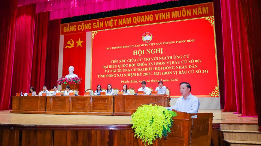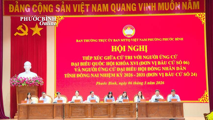 Chiều ngày 6/3, tại phường Phước Bình, Ban Thường trực UBMTTQVN phường Phước Bình tổ chức Hội nghị tiếp xúc giữa người ứng cử đại biểu Quốc hội khóa XVI (đơn vị bầu cử số 6), Đại biểu HĐND tỉnh nhiệm kỳ 2026 - 2031 (đơn vị bầu cử số 24) với cử tri các xã phường: Phước Bình, Phước Long, Nghĩa Trung và Phú Trung.