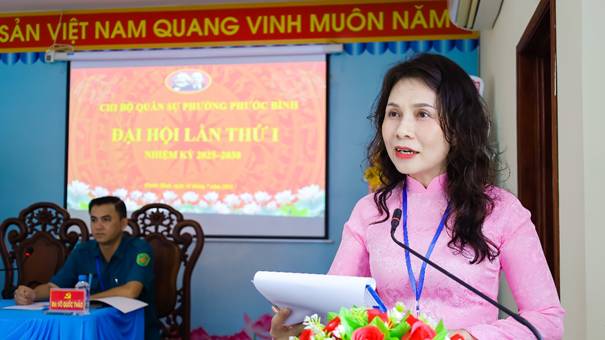 Đồng chí Phạm Thị Anh Thư – Phó Bí thư Thường trực Đảng ủy, Chủ tịch HĐND phường Phước Bình phát biểu tại Đại hội