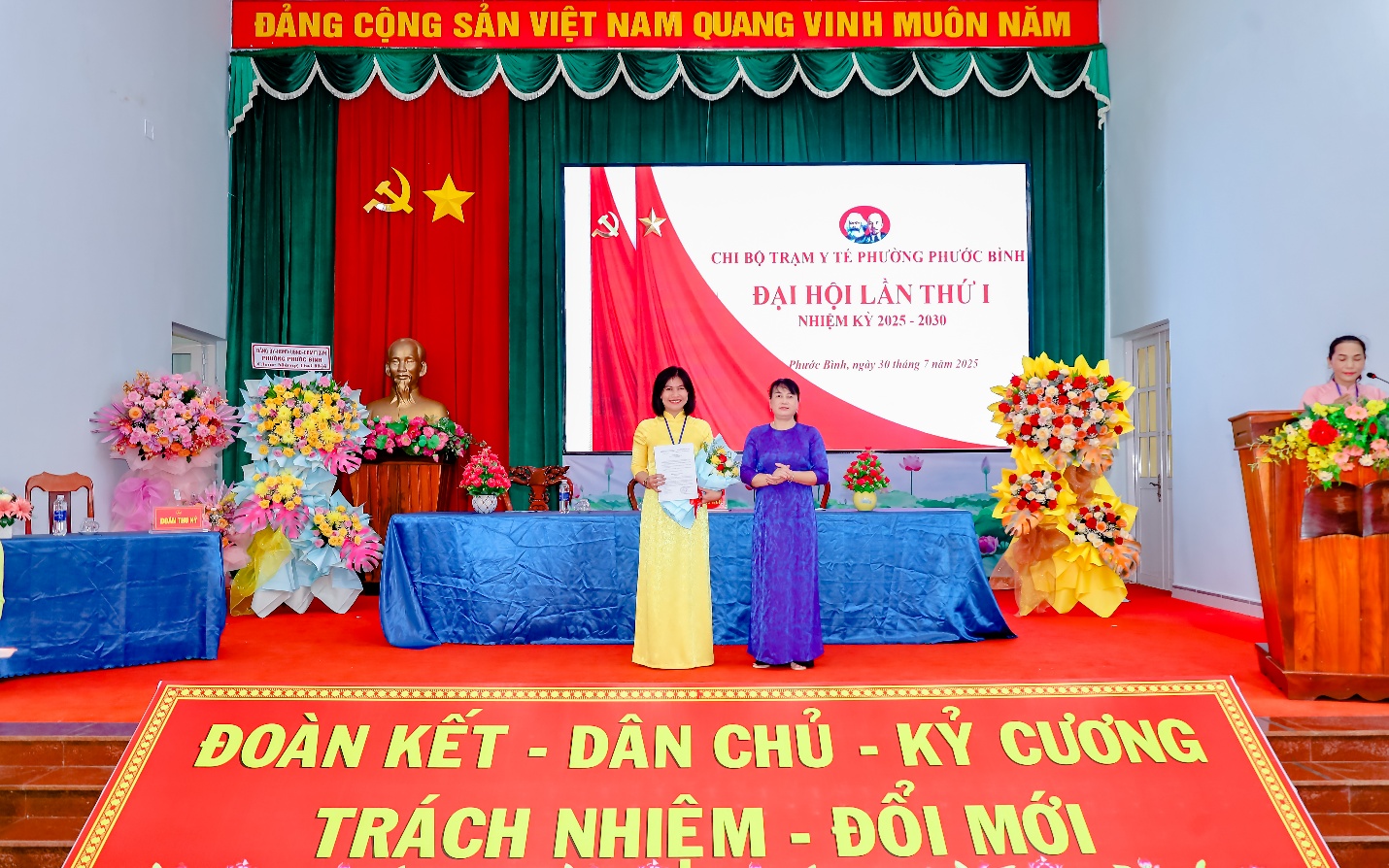 Chiều ngày 30/7/2025, Chi bộ Trạm y tế phường Phước Bình tổ chức Đại hội lần thứ I, nhiệm kỳ 2025 – 2030. Đồng chí Bùi Thị Hằng – UV.BTV Đảng ủy, Phó Chủ tịch UBND kiêm Giám đốc Trung tâm phục vụ hành chính công phường Phước Bình dự Đại hội và trao Quyết định chỉ định Bí thư Chi bộ Trạm Y tế phường Phước Bình đối với đồng chí Lê Thị Thúy Sinh – Bác sĩ phụ trách Trạm Y tế phường.
