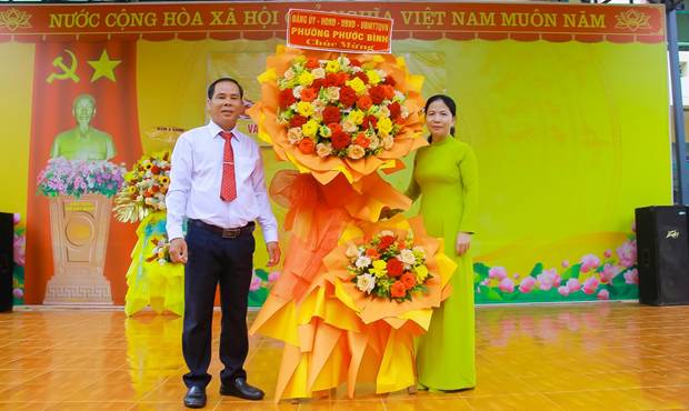 Đồng chí Nguyễn Thị Tuyết Trinh – Trưởng phòng VH-XH phường Phước Bình tặng lẵng hoa chúc mừng