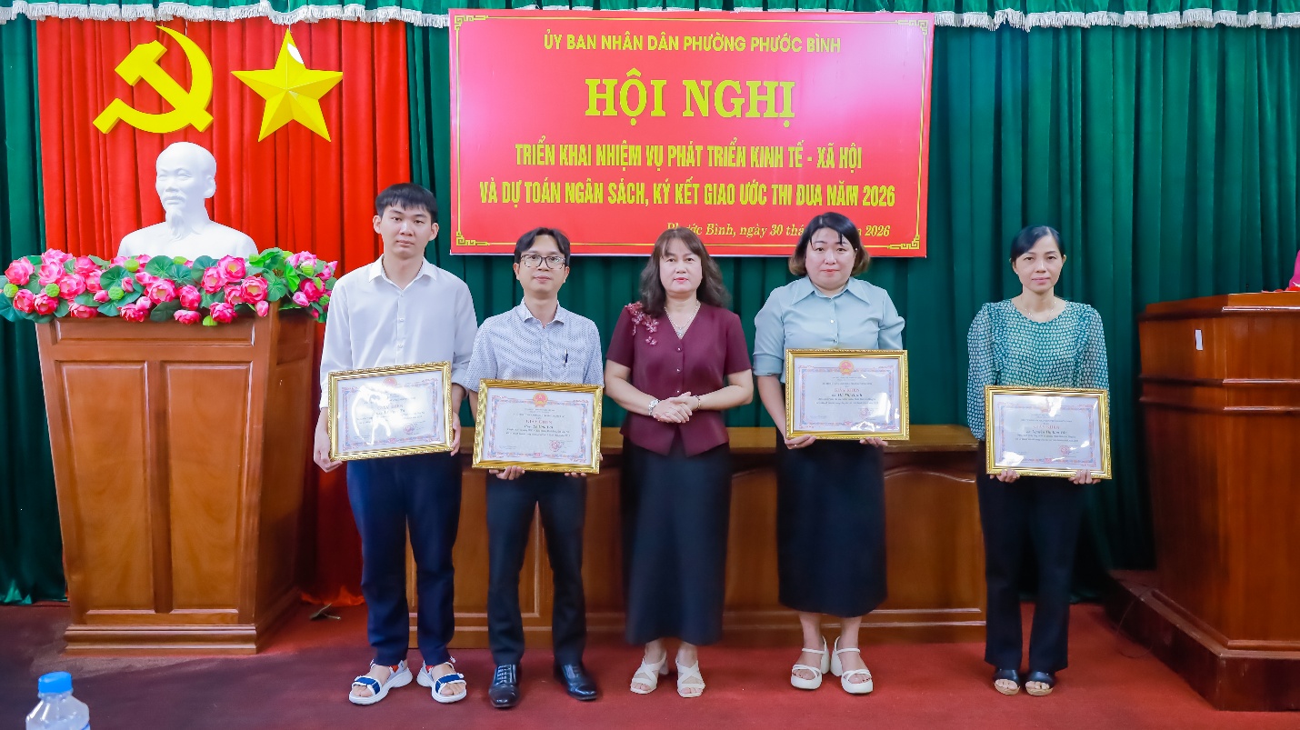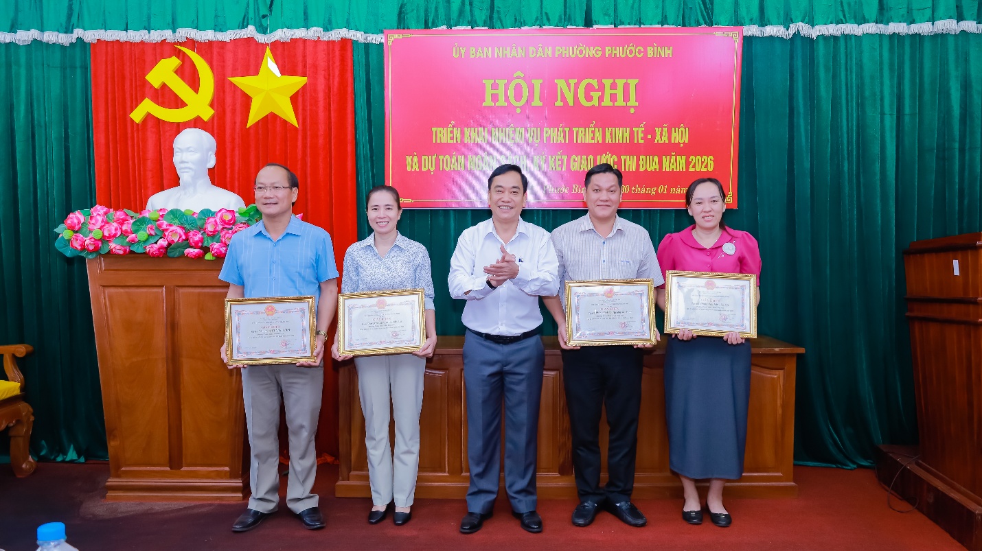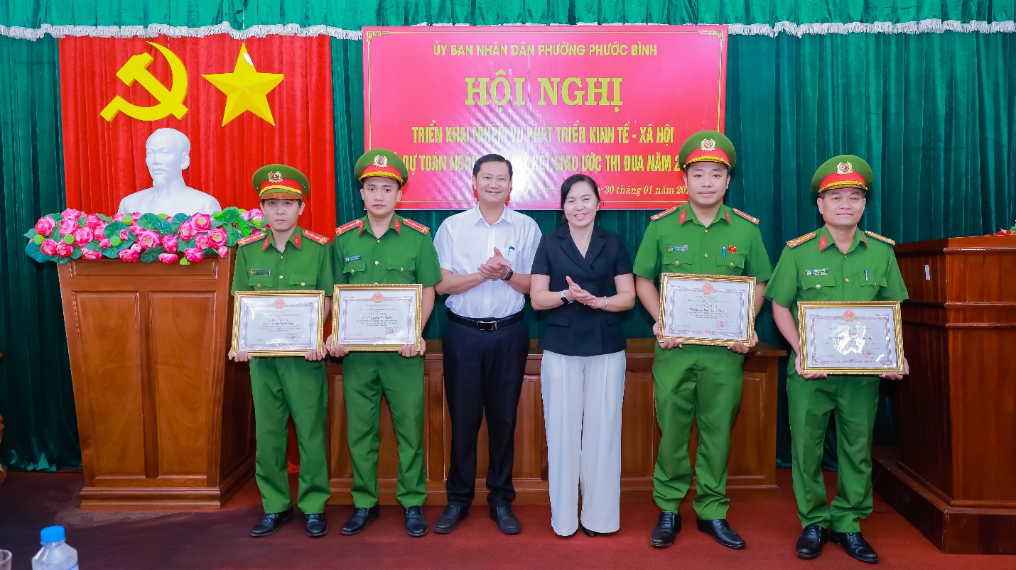 Dịp này, UBND phường đã tuyên dương, khen thưởng 04 tập thể, 04 cá nhân có thành tích xuất sắc trong công tác cải cách hành chính phường Phước Bình năm 2025. Đồng thời cũng khen thưởng đột xuất 01 tập thể, 05 cá nhân có thành tích xuất sắc trong công tác đấu tranh phòng chống tội phạm trên địa bàn phường thời gian qua.