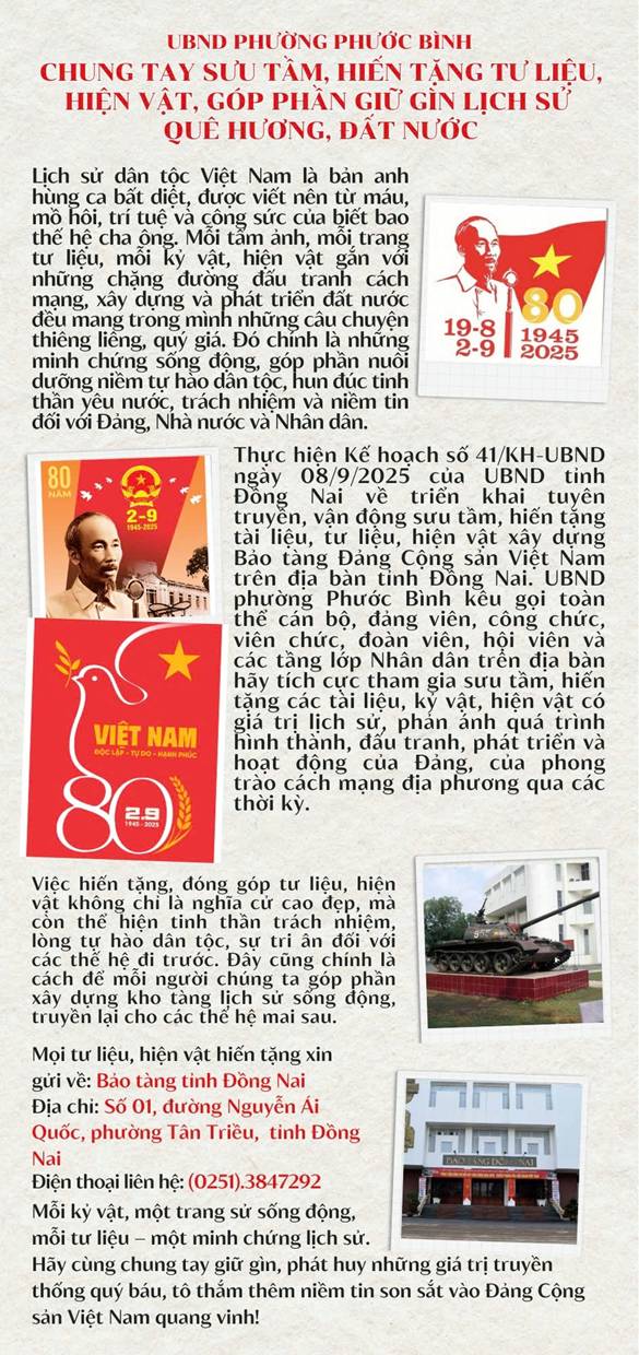 Thực hiện Kế hoạch số 41/KH-UBND ngày 08/9/2025 của UBND tỉnh Đồng Nai về triển khai tuyên truyền, vận động sưu tầm, hiến tặng tài liệu, tư liệu, hiện vật xây dựng Bảo tàng Đảng Cộng sản Việt Nam trên địa bàn tỉnh Đồng Nai. UBND phường Phước Bình kêu gọi toàn thể cán bộ, đảng viên, công chức, viên chức, đoàn viên, hội viên và các tầng lớp Nhân dân trên địa bàn hãy tích cực tham gia sưu tầm, hiến tặng các tài liệu, kỷ vật, hiện vật có giá trị lịch sử, phản ánh quá trình hình thành, đấu tranh, phát triển và hoạt động của Đảng, của phong trào cách mạng địa phương qua các thời kỳ.