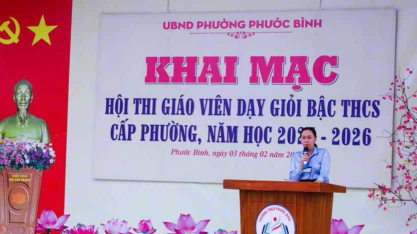 Phát biểu tại chương trình khai mạc, bà Nguyễn Thị Tuyết Trinh, Trưởng Phòng Văn hóa - Xã hội phường Phước Bình nhấn mạnh: Hội thi giáo viên dạy giỏi bậc THCS cấp phường năm học 2025-2026 là hoạt động chuyên môn có ý nghĩa quan trọng, góp phần đánh giá thực chất năng lực, trình độ chuyên môn, nghiệp vụ sư phạm của đội ngũ giáo viên. Đồng thời đề nghị Ban tổ chức, Ban giám khảo làm việc khách quan, công tâm; các giáo viên tham gia hội thi phát huy tinh thần trách nhiệm, tự tin thể hiện năng lực, góp phần vào thành công chung của hội thi.