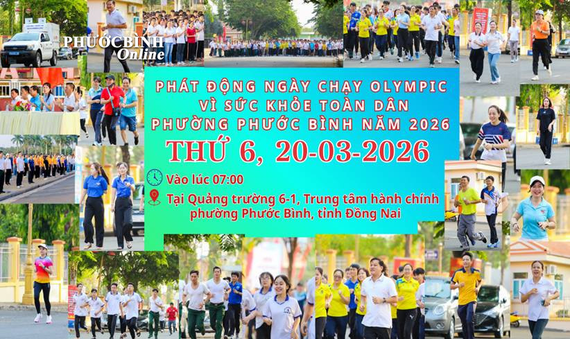 Thiết thực chào mừng kỷ niệm 80 năm Ngày thành lập ngành Thể dục Thể thao Việt Nam (27/3/1946 – 27/3/2026); 95 năm Ngày thành lập Đoàn thanh niên Cộng sản Hồ Chí Minh (26/3/1931 – 26/3/2026); khuyến khích đông đảo Nhân dân tham gia luyện tập thể dục, thể thao theo gương Bác Hồ vĩ đại và phong trào “Khỏe để lập nghiệp và giữ nước”, UBND phường Phước Bình thông báo đến toàn thể cán bộ, công chức, viên chức, lực lượng vũ trang, các cơ quan, ban ngành, đoàn thể chính trị xã hội, các công ty, doanh nghiệp cùng toàn thể Nhân dân trên địa bàn phường đến tham gia chạy hưởng ứng Ngày chạy Olympic vì sức khỏe toàn dân phường Phước Bình năm 2026.