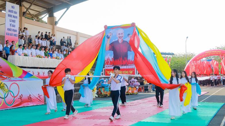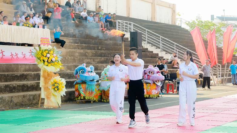 Tiết mục đồng diễn của hơn 500 vận động viên là học sinh trường THCS, THPT trên địa bàn tạo nên không khí sôi nổi và điểm nhấn ấn tượng của Lễ khai mạc.