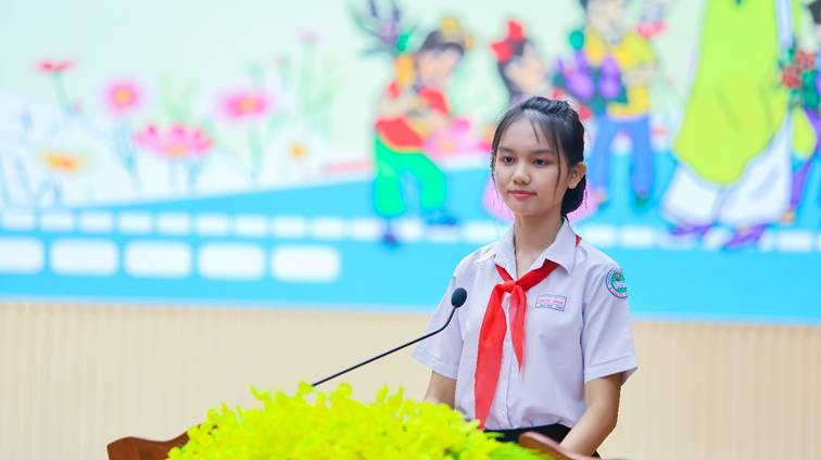 Em Phạm Nguyễn Nhã Thanh – Học sinh Trường THCS Long Phước, đại diện học sinh toàn phường phát biểu tri ân thầy cô.