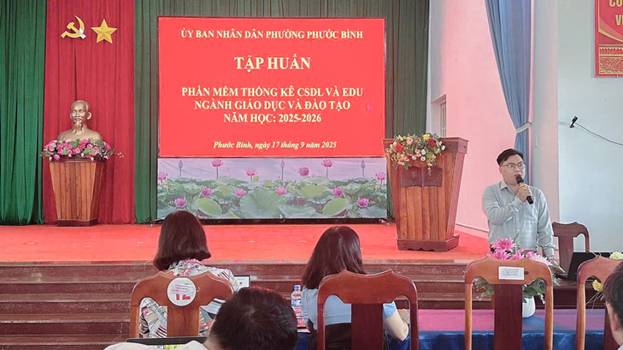 Sáng ngày 17/9, UBND phường Phước Bình đã tổ chức tập huấn phần mềm thống kê cơ sở dữ liệu (CSDL) và EDU trong ngành Giáo dục đào tạo năm học 2025-2026. Dự lớp tập huấn có bà Trần Thị Tuyết – Phó Trưởng phòng VH-XH phường; Đại diện Tập đoàn Công Nghệ Quảng Ích cùng đông đảo cán bộ, giáo viên, nhân viên 13 trường TH, THCS và Mầm non công lập trên địa bàn.