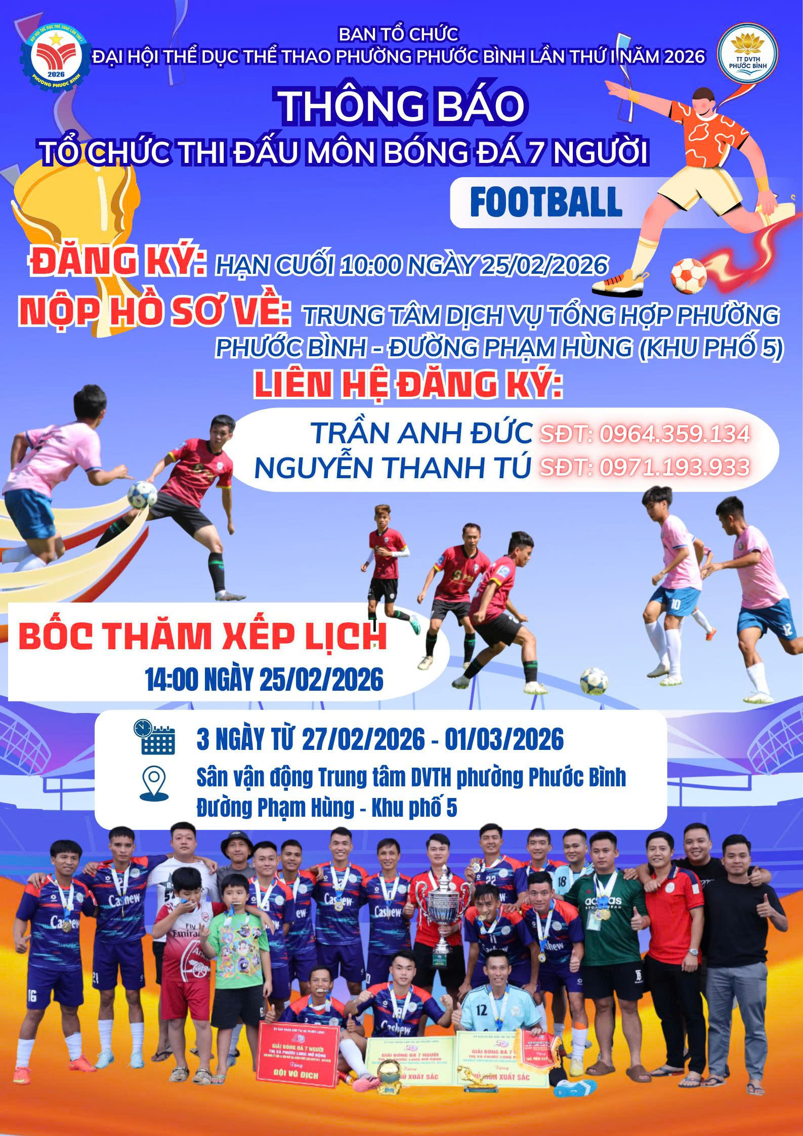 Ban Tổ chức Đại hội Thể dục Thể thao phường Phước Bình lần thứ I năm 2026 thông báo tổ chức thi đấu môn bóng đá nam 7 người, Ban Tổ chức kính mời các đội bóng trên địa bàn phường tích cực đăng ký tham gia, góp phần tạo không khí thi đua sôi nổi, nâng cao phong trào rèn luyện thể dục thể thao và chào mừng Đại hội Thể dục Thể thao phường Phước Bình lần thứ I năm 2026.