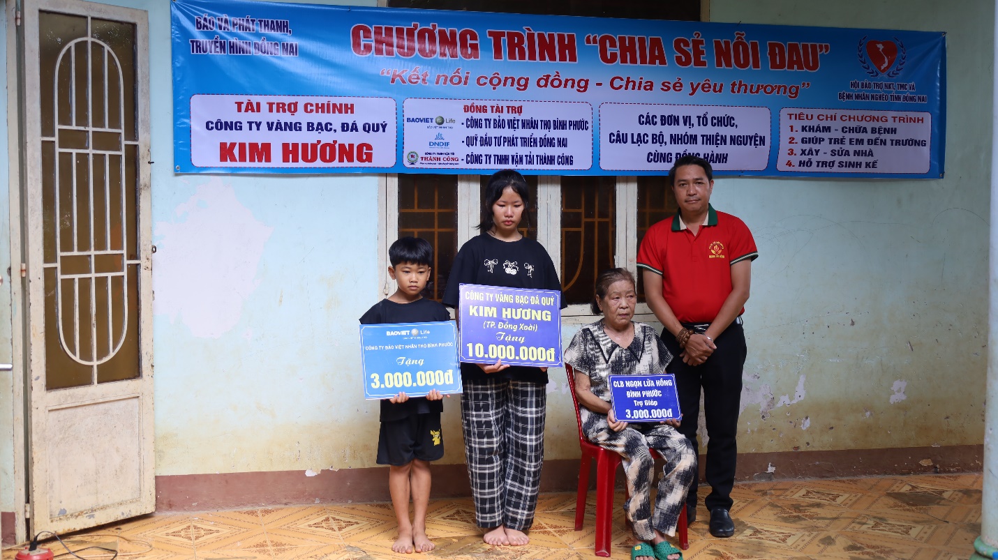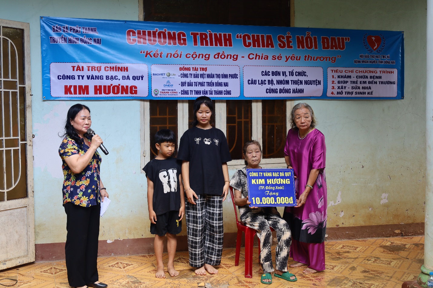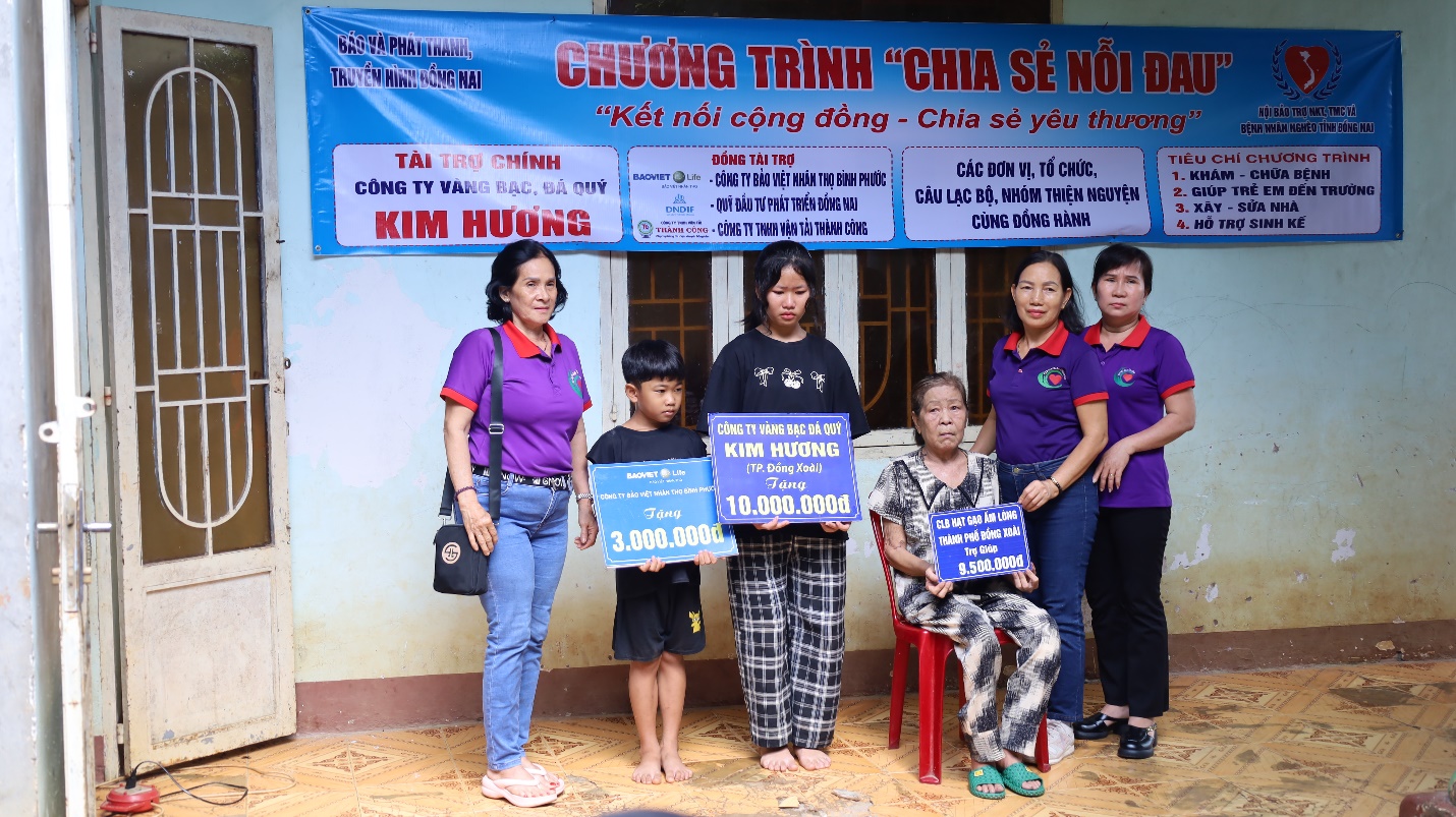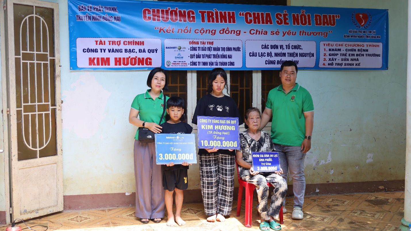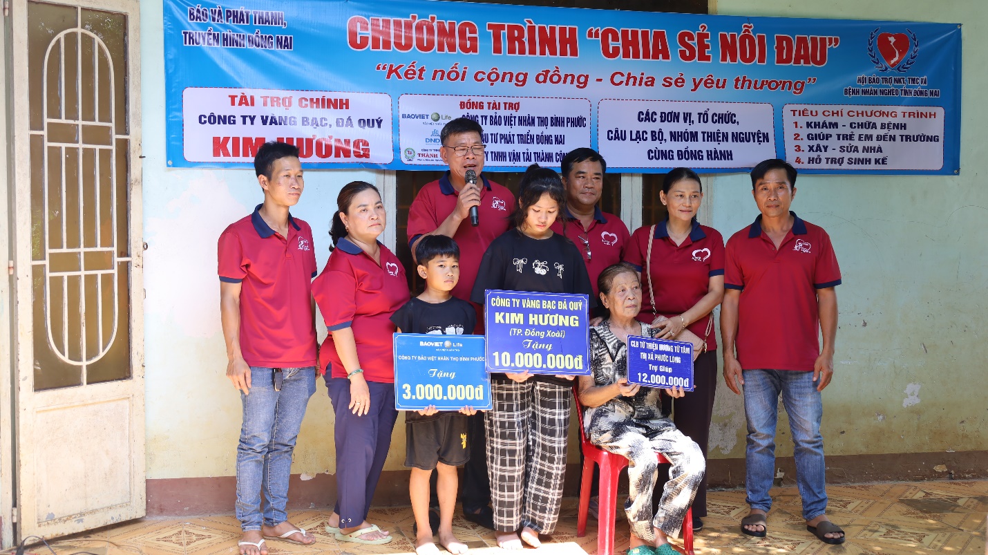 Ngày 12-7, Báo và phát thanh, truyền hình Đồng Nai phối hợp với Hội Bảo trợ người khuyết tật - trẻ mồ côi và bệnh nhân nghèo tỉnh tổ chức chương trình “Chia sẻ nỗi đau” trợ giúp gia đình bà Trương Thị Hồng Hoàng (ngụ Tổ dân phố An Lương, phường Phước Bình, tỉnh Đồng Nai) với sự đồng hành của nhà tài trợ chính là Công ty Vàng bạc đá quý Kim Hương (phường Bình Phước) cùng các đơn vị đồng tài trợ: Công ty TNHH Vận tải Thành Công, Quỹ Đầu tư phát triển tỉnh Đồng Nai, Công ty Bảo Việt nhân thọ Bình Phước và các câu lạc bộ, đội, nhóm thiện nguyện trong tỉnh. Dự chương trình có đồng chí Bùi Thị Hằng – UV BTV, Phó Chủ tịch UBND kiêm Giám đốc Trung tâm phục vụ hành chính công phường Phước Bình; đ/c Nguyễn Huy Thắng – ĐUV, Phó Chủ tịch Thường trực Ủy ban MTTQVN kiêm Chủ tịch Hội Nông dân phường.