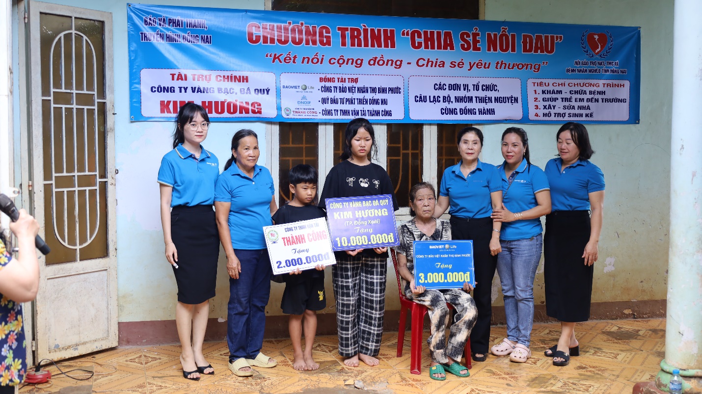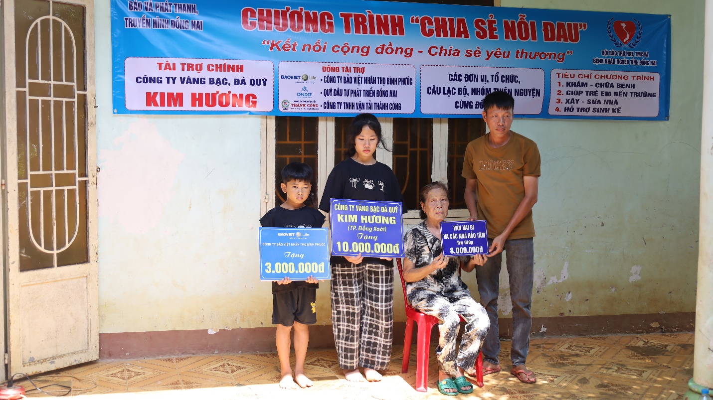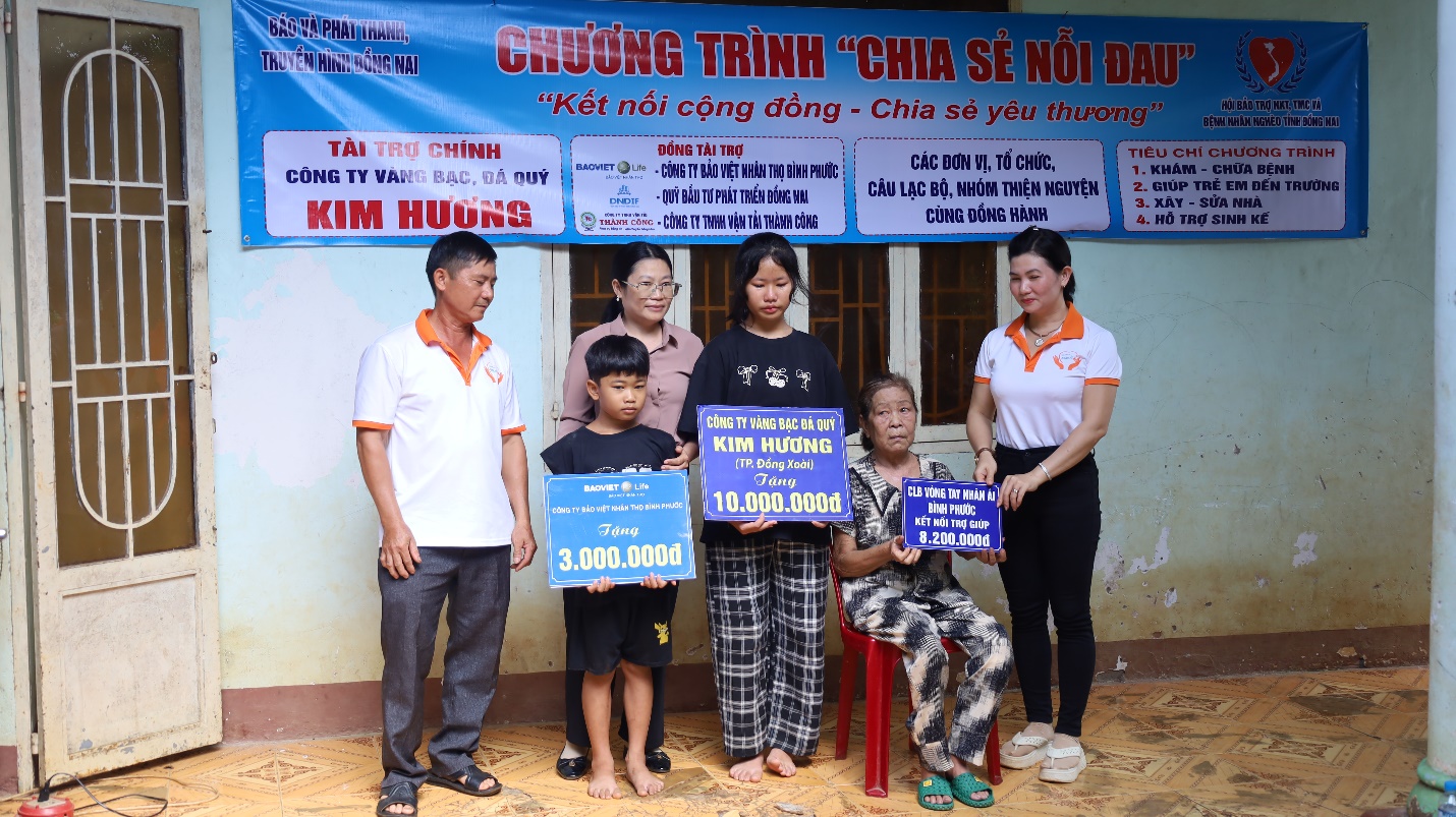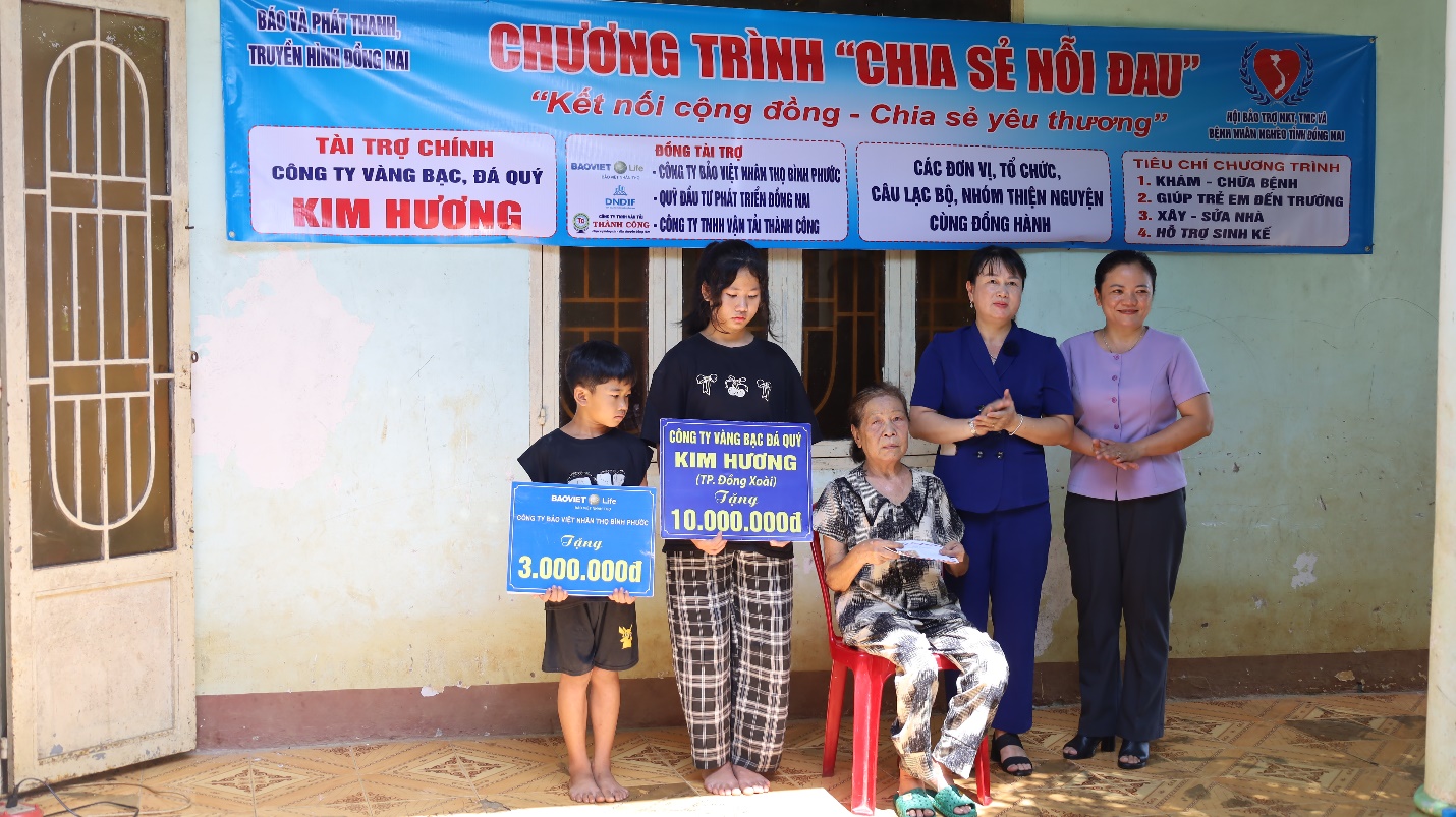 Ngày 12-7, Báo và phát thanh, truyền hình Đồng Nai phối hợp với Hội Bảo trợ người khuyết tật - trẻ mồ côi và bệnh nhân nghèo tỉnh tổ chức chương trình “Chia sẻ nỗi đau” trợ giúp gia đình bà Trương Thị Hồng Hoàng (ngụ Tổ dân phố An Lương, phường Phước Bình, tỉnh Đồng Nai) với sự đồng hành của nhà tài trợ chính là Công ty Vàng bạc đá quý Kim Hương (phường Bình Phước) cùng các đơn vị đồng tài trợ: Công ty TNHH Vận tải Thành Công, Quỹ Đầu tư phát triển tỉnh Đồng Nai, Công ty Bảo Việt nhân thọ Bình Phước và các câu lạc bộ, đội, nhóm thiện nguyện trong tỉnh. Dự chương trình có đồng chí Bùi Thị Hằng – UV BTV, Phó Chủ tịch UBND kiêm Giám đốc Trung tâm phục vụ hành chính công phường Phước Bình; đ/c Nguyễn Huy Thắng – ĐUV, Phó Chủ tịch Thường trực Ủy ban MTTQVN kiêm Chủ tịch Hội Nông dân phường.