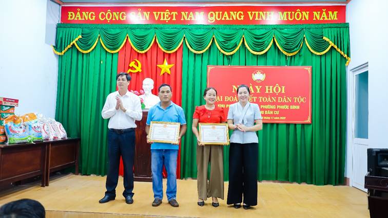 Dịp này, lãnh đạo Đảng ủy, HĐND, UBND, UBMTTQVN phường cũng đã tặng Khu phố 1 phần quà chúc mừng trị giá 3 triệu đồng; Tặng giấy khen của Chủ tịch UBND phường Phước Bình cho 02 hộ có thành tích xuất sắc trong phong trào “Toàn dân đoàn kết xây dựng đời sống văn hóa” năm 2025 cũng như trao tặng 12 phần quà của mạnh thường quân cho các hộ có hoàn cảnh khó khăn trên địa bàn.